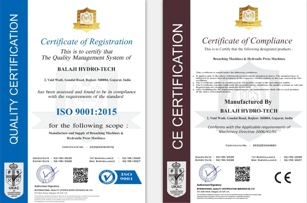 | Operating Features | Internal Broaching. Vertical - Pull Type Working. Keyway, Double Keyway, Spline, Serration, Square, Hex, etc. SS, MS, Cast Iron, Carbon Steel, Brass, Aluminiu, etc. Automatic Pull Broach Holder and Upper Henging Holder. Best Suitable for Medium and Big Size Components. Suitable for High Production Capacity. Hydraulic Auto Retrieval System. Touch Free Cutter Broaching Operation. Auto Brushing on Cutter. |