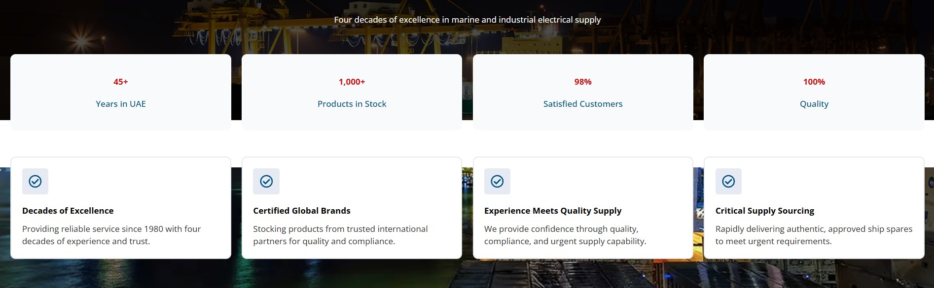 Founded in 1980, Al Muneera Electricals has grown from a small trading company to become one of the UAE’s most trusted suppliers of marine and industrial electrical equipment. Our journey spans over four decades of dedication to quality, service, and technical expertise Based in Dubai Maritime City, we are strategically positioned to serve the marine, oil & gas, and industrial sectors across the UAE and wider GCC region. Our comprehensive inventory of over 10,000 products from leading global manufacturers ensures we can meet even the most demanding requirements. What sets us apart is our deep technical knowledge combined with exceptional customer service. Our team of experienced engineers understands the unique challenges of marine and hazardous area installations, providing expert guidance on product selection, compliance, and installation.