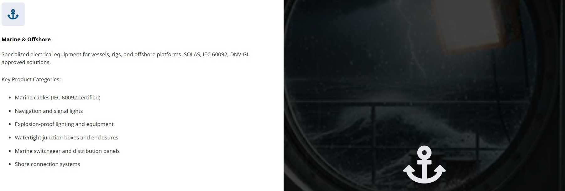 | Usage | Power, control, and emergency lighting circuits in marine and offshore installations, especially areas requiring fire and mud resistance |