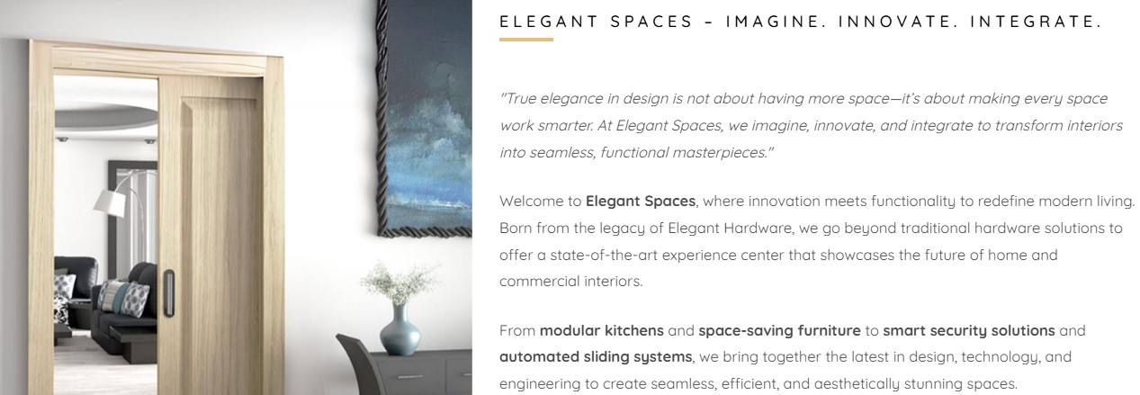 Elegant Spaces is an evolution of Elegant Hardware, a company founded in 2003 by Mr. Mufaddal Zaveri, a visionary Mechanical Engineer with a passion for precision and innovation. Under his leadership, Elegant Hardware established itself as a market leader in premium door hardware and furniture fittings, serving a distinguished clientele of architects, interior designers, builders, turnkey contractors, corporate offices, luxury residences and hotels.. Building on this legacy, Elegant Spaces was created to expand our expertise into the world of modular kitchens, space-saving furniture, automated doors, smart security, and innovative sliding systems—transforming spaces with the latest in technology and design.