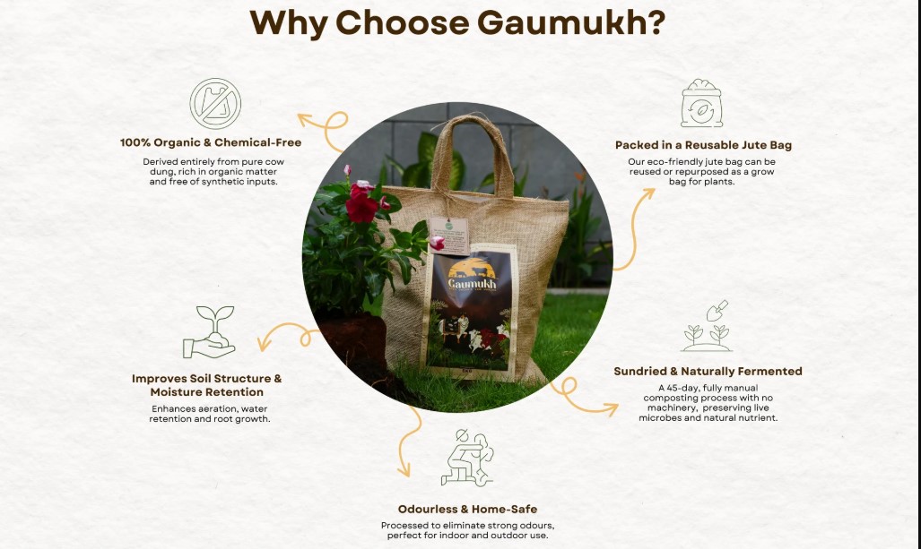 | Environmental Claims | 100% organic, odour-free, eco-friendly, non‑toxic, improves soil fertility and water‑holding capacity, sustainable and cruelty‑free initiative supporting rescued cows, eco‑friendly reusable grow bag packaging |