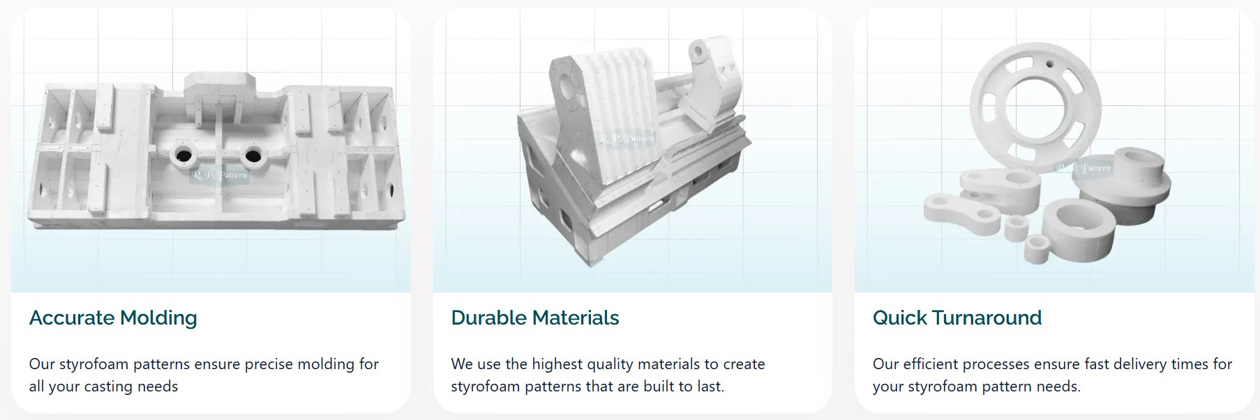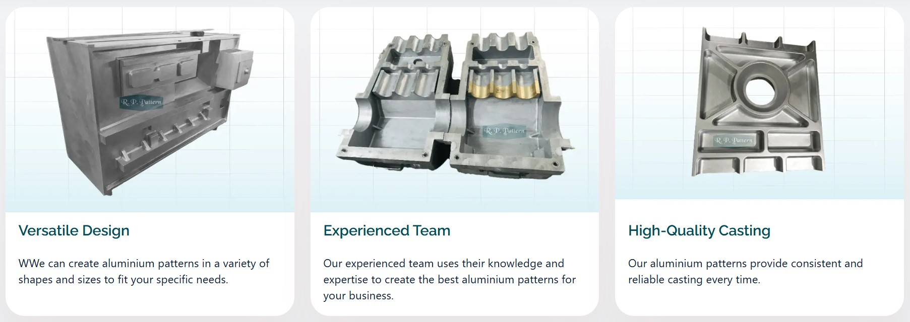 | Materials | Patterns: Aluminium, Wood, Styrofoam; Castings: SS, WCB, DI |