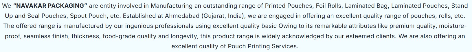 | Functionality | Moisture-proof packaging, food-grade use, seamless finish, good thickness, longer-lasting pouch for packaged goods |