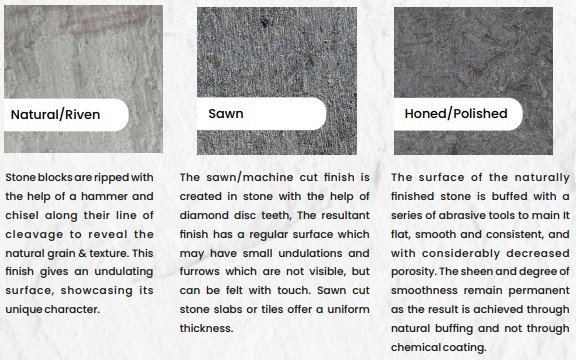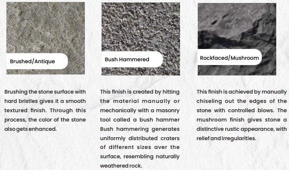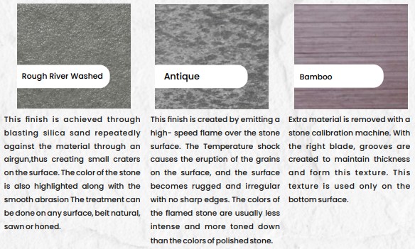 | Top Surface Finish | Natural or Riven, Sawn, Honed or Polished, Rough River Washed, Antique, Brushed or Antique, Bush Hammered, Rockfaced or Mushroom |