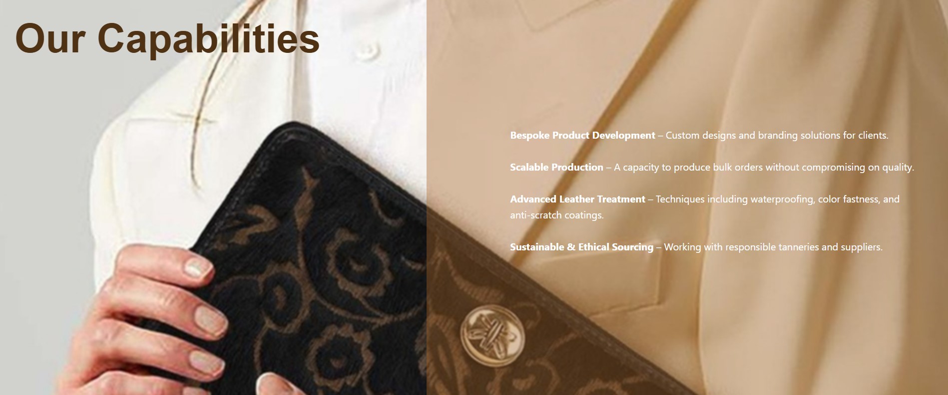 {{block class="Magento\Framework\View\Element\Template" image="" text=" About Us" template="MGS_Fbuilder::widget/imagetext/imagetext.phtml"}}{{block class="Magento\Framework\View\Element\Template" type="single" image="/1/_/1_10.jpg" alt="" alt_after="" template="MGS_Fbuilder::widget/image/single.phtml"}} {{block class="Magento\Framework\View\Element\Template" image=" " text=" Sage & Hide Exim Pvt Ltd, is a specialized OEM and private-label manufacturer of premium leather manufacturer of premium leather goods based in India. We offer customized B2B manufacturing solutions for businesses like your, tailored to meet global quality standards and brand-specific requirements. Founded with a passion for fine craftsmanship, our journey in the leather industry began with a vision to bring premium Indian leather goods to global markets. From a humble beginning as small workshop, we have grown into a globally recognized brand, known for our commitment to excellence and innovation. Our artisans, trained in time-honored techniques, create each product with precision and care. We take pride in our commitment to quality, sustainability, and ethical business practices, ensuring our products reflect the best of Indian heritage and modern innovation. " template="MGS_Fbuilder::widget/imagetext/imagetext.phtml"}}{{block class="Magento\Framework\View\Element\Template" image="" text=" Our Products" template="MGS_Fbuilder::widget/imagetext/imagetext.phtml"}}{{block class="Magento\Framework\View\Element\Template" type="single" image="/2/_/2_10.jpg" alt="" alt_after="" template="MGS_Fbuilder::widget/image/single.phtml"}} {{block class="Magento\Framework\View\Element\Template" type="single" image="/3/_/3_9.jpg" alt="" alt_after="" template="MGS_Fbuilder::widget/image/single.phtml"}} {{block class="Magento\Framework\View\Element\Template" type="single" image="/4/_/4_9.jpg" alt="" alt_after="" template="MGS_Fbuilder::widget/image/single.phtml"}} {{block class="Magento\Framework\View\Element\Template" type="single" image="/5/_/5_5.jpg" alt="" alt_after="" template="MGS_Fbuilder::widget/image/single.phtml"}} {{block class="Magento\Framework\View\Element\Template" type="single" image="/6/_/6_4.jpg" alt="" alt_after="" template="MGS_Fbuilder::widget/image/single.phtml"}} {{block class="Magento\Framework\View\Element\Template" type="single" image="/8/_/8_3.jpg" alt="" alt_after="" template="MGS_Fbuilder::widget/image/single.phtml"}} {{block class="Magento\Framework\View\Element\Template" type="single" image="/7/_/7_4.jpg" alt="" alt_after="" template="MGS_Fbuilder::widget/image/single.phtml"}} |