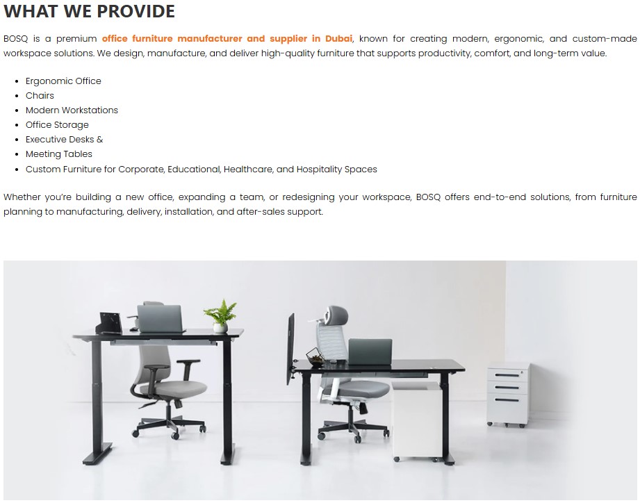 Bosq UAE is a premium office furniture brand with roots in India, established in 2012. We began our journey crafting ergonomic seating solutions for leading corporations. With a strong focus on design innovation, comfort, and quality, we’ve grown into one of the UAE’s top providers of office furniture and workspace solutions. Our prestigious clients include brands like BMW, Audi, and Siemens. Today, Bosq continues to expand its presence across the UAE and GCC markets.