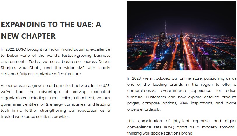 {{block class="Magento\Framework\View\Element\Template" image="" text=" About Us" template="MGS_Fbuilder::widget/imagetext/imagetext.phtml"}}{{block class="Magento\Framework\View\Element\Template" type="single" image="/1/1/1152x535-optron-workstation-updated-banner_2.png" alt="" alt_after="" template="MGS_Fbuilder::widget/image/single.phtml"}} {{block class="Magento\Framework\View\Element\Template" image="" text=" Bosq UAE is a premium office furniture brand with roots in India, established in 2012. We began our journey crafting ergonomic seating solutions for leading corporations. With a strong focus on design innovation, comfort, and quality, we’ve grown into one of the UAE’s top providers of office furniture and workspace solutions. Our prestigious clients include brands like BMW, Audi, and Siemens. Today, Bosq continues to expand its presence across the UAE and GCC markets. " template="MGS_Fbuilder::widget/imagetext/imagetext.phtml"}}{{block class="Magento\Framework\View\Element\Template" type="single" image="/s/c/screenshot_22_2.jpg" alt="" alt_after="" template="MGS_Fbuilder::widget/image/single.phtml"}} {{block class="Magento\Framework\View\Element\Template" type="single" image="/s/c/screenshot_1_9.jpg" alt="" alt_after="" template="MGS_Fbuilder::widget/image/single.phtml"}} {{block class="Magento\Framework\View\Element\Template" type="single" image="/s/c/screenshot_2_8.jpg" alt="" alt_after="" template="MGS_Fbuilder::widget/image/single.phtml"}} {{block class="Magento\Framework\View\Element\Template" type="single" image="/s/c/screenshot_21_2.jpg" alt="" alt_after="" template="MGS_Fbuilder::widget/image/single.phtml"}} {{block class="Magento\Framework\View\Element\Template" image="" text=" Our Products" template="MGS_Fbuilder::widget/imagetext/imagetext.phtml"}}{{block class="Magento\Framework\View\Element\Template" type="single" image="/s/c/screenshot_4_7.jpg" alt="" alt_after="" template="MGS_Fbuilder::widget/image/single.phtml"}} {{block class="Magento\Framework\View\Element\Template" type="single" image="/s/c/screenshot_5_10.jpg" alt="" alt_after="" template="MGS_Fbuilder::widget/image/single.phtml"}} {{block class="Magento\Framework\View\Element\Template" type="single" image="/s/c/screenshot_7_7.jpg" alt="" alt_after="" template="MGS_Fbuilder::widget/image/single.phtml"}} {{block class="Magento\Framework\View\Element\Template" type="single" image="/s/c/screenshot_19_5.jpg" alt="" alt_after="" template="MGS_Fbuilder::widget/image/single.phtml"}} {{block class="Magento\Framework\View\Element\Template" type="single" image="/s/c/screenshot_20_3.jpg" alt="" alt_after="" template="MGS_Fbuilder::widget/image/single.phtml"}} {{block class="Magento\Framework\View\Element\Template" image="" text=" Our Expertise" template="MGS_Fbuilder::widget/imagetext/imagetext.phtml"}}{{block class="Magento\Framework\View\Element\Template" type="single" image="/s/c/screenshot_6_9.jpg" alt="" alt_after="" template="MGS_Fbuilder::widget/image/single.phtml"}} {{block class="Magento\Framework\View\Element\Template" image="" text=" Our Clients" template="MGS_Fbuilder::widget/imagetext/imagetext.phtml"}}{{block class="Magento\Framework\View\Element\Template" type="single" image="/s/c/screenshot_14_4.jpg" alt="" alt_after="" template="MGS_Fbuilder::widget/image/single.phtml"}} {{block class="Magento\Framework\View\Element\Template" type="single" image="/s/c/screenshot_15_3.jpg" alt="" alt_after="" template="MGS_Fbuilder::widget/image/single.phtml"}} {{block class="Magento\Framework\View\Element\Template" type="single" image="/s/c/screenshot_16_3.jpg" alt="" alt_after="" template="MGS_Fbuilder::widget/image/single.phtml"}} {{block class="Magento\Framework\View\Element\Template" type="single" image="/s/c/screenshot_17_3.jpg" alt="" alt_after="" template="MGS_Fbuilder::widget/image/single.phtml"}} {{block class="Magento\Framework\View\Element\Template" type="single" image="/s/c/screenshot_18_3.jpg" alt="" alt_after="" template="MGS_Fbuilder::widget/image/single.phtml"}} |
