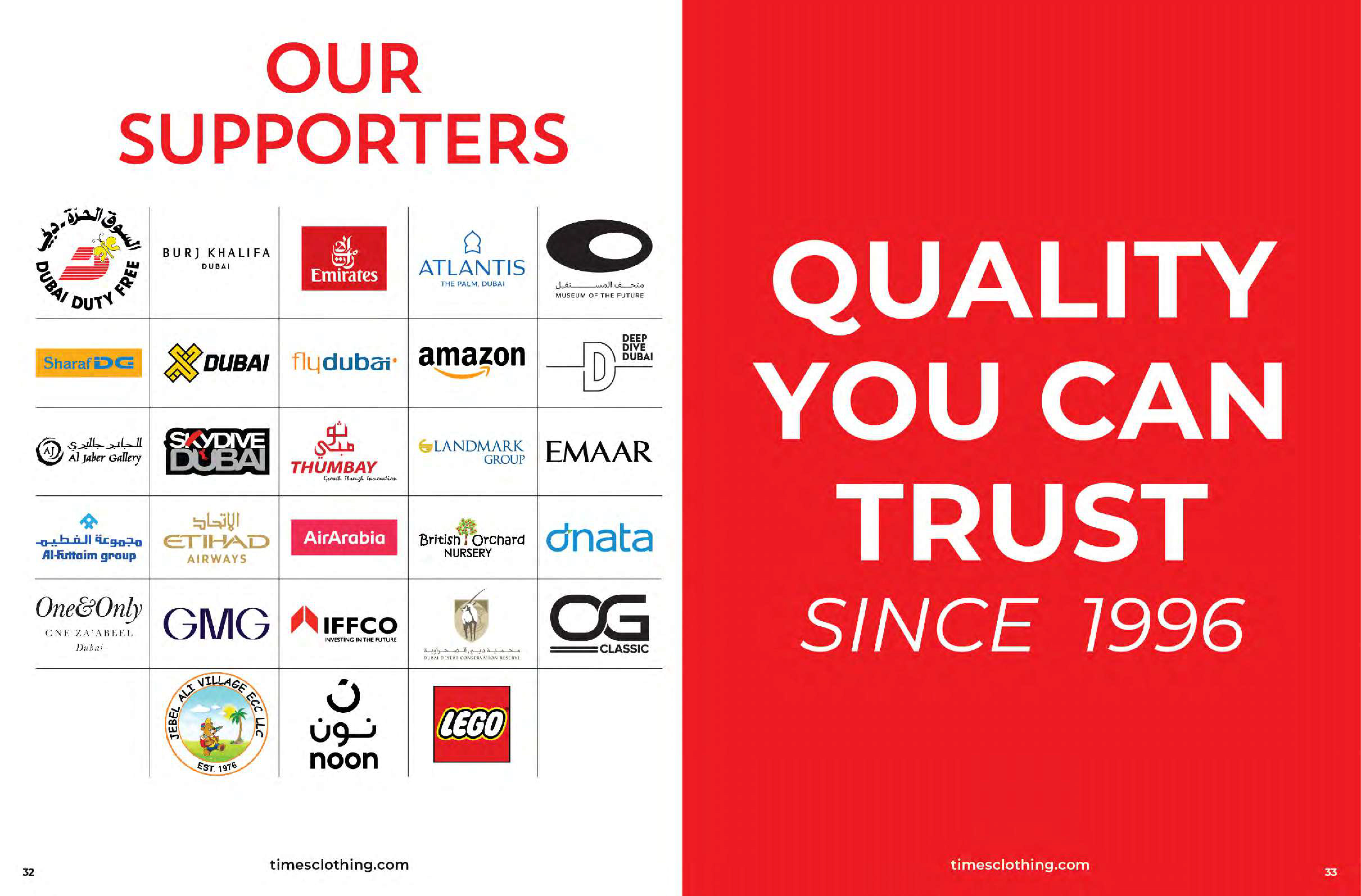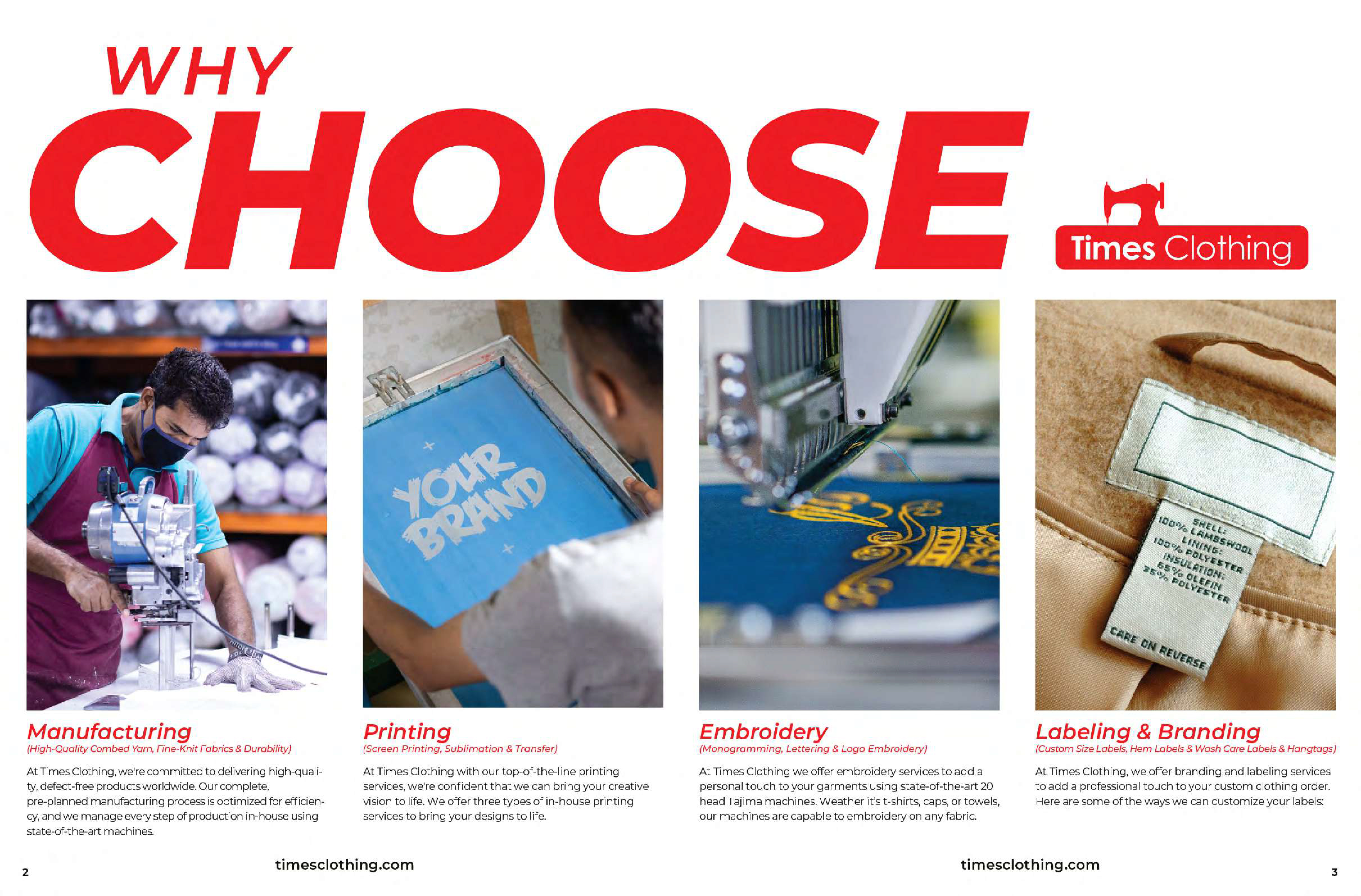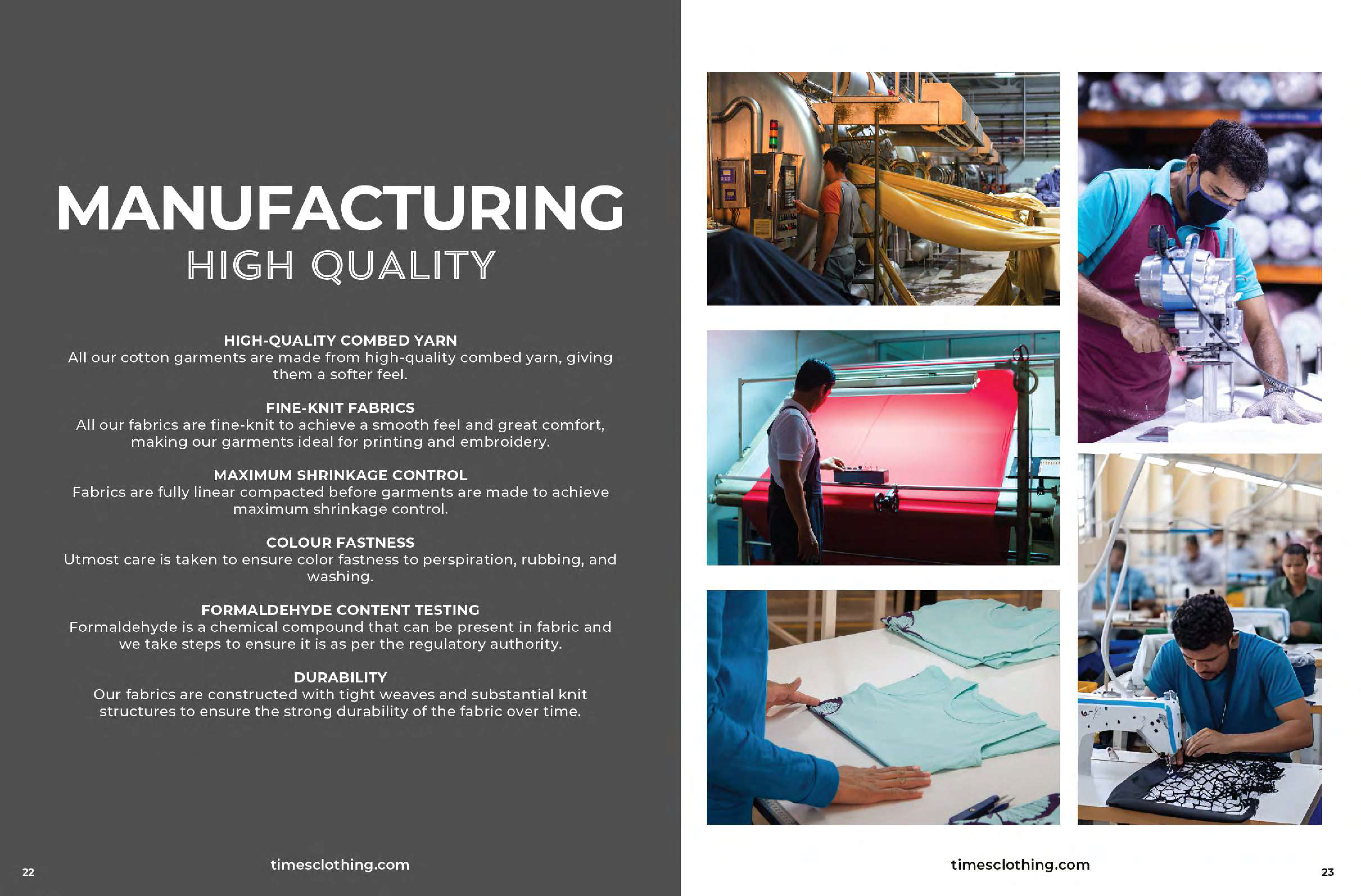 At Times Clothing, our in-house manufacturing process ensures quality control from yarn sourcing to packaging the finished product. In Mumbai, India, we process the yarn into fabric, dye it, and quality-check it before cutting and stitching it into a variety of garments. These garments are then embroidered or printed and individually packed at our Dubai, UAE unit. We specialize in manufacturing a range of advanced quality merchandize and garment products to meet our customers’ needs. We pride ourselves on producing and supplying top-quality garments at competitive prices while providing the best service to our customers. By fully understanding our customers’ unique requirements, we work closely with them to provide the finest garment products. Our product range includes Men’s Wear, Ladies Wear, Children’s Wear, Sports Wear, and more. We cater to prominent clients and are capable of executing orders at short notice, committed to meeting various customer needs.